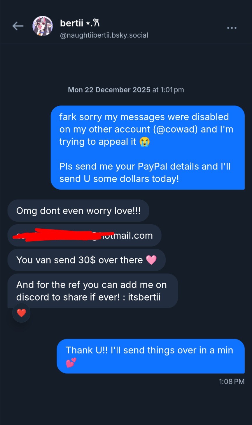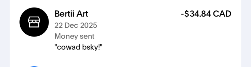 - commissioned a half body sketch for $30CAD on 22/12/25, sent a $5 tip ($34.84 after PayPal fees)