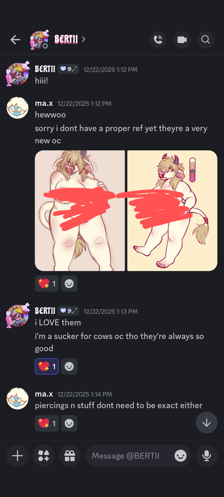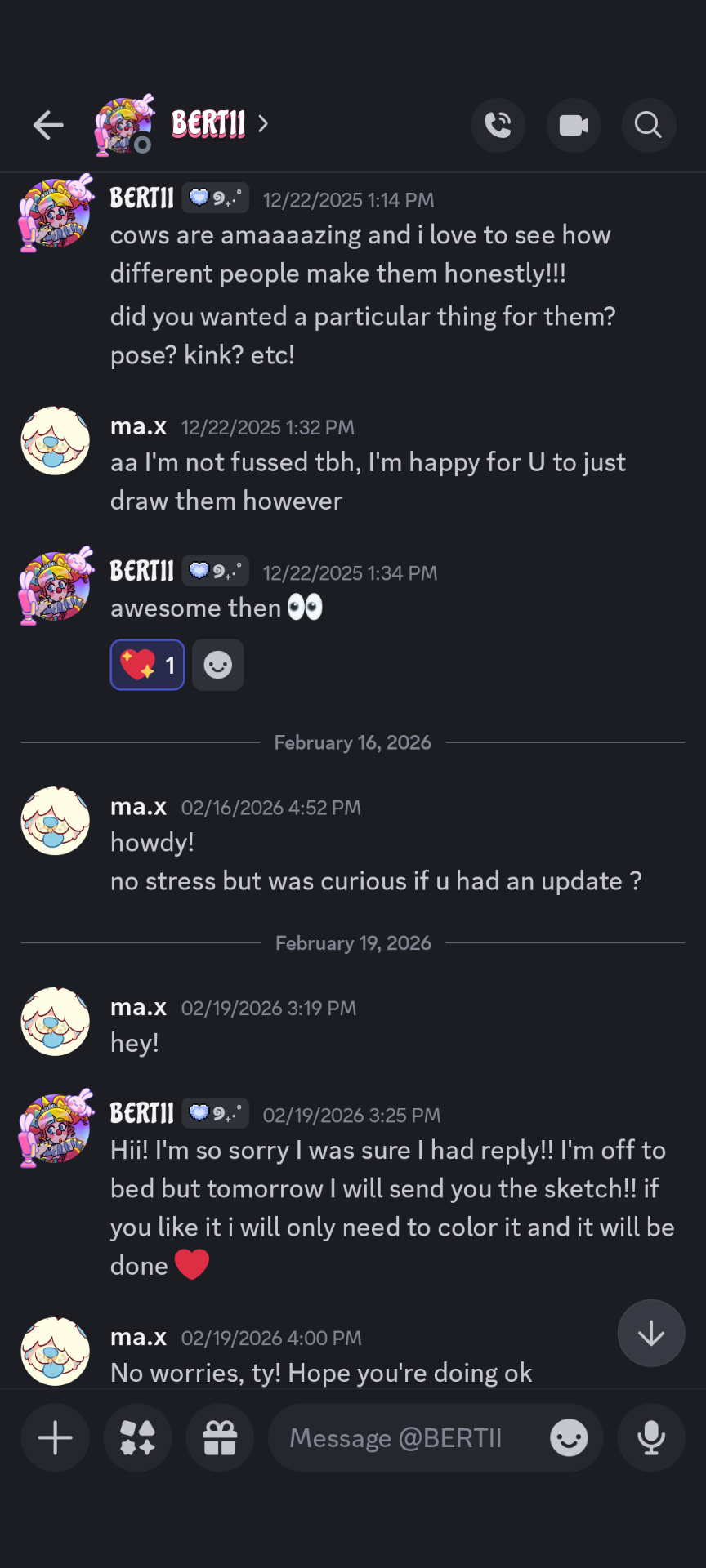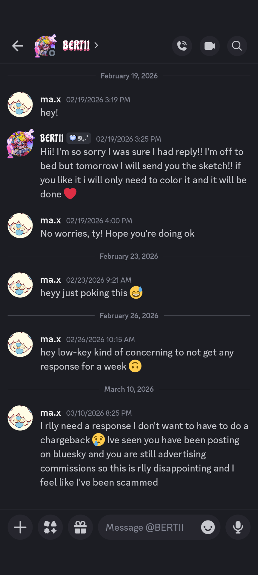 - also nearly daily active on discord but hasn't responded to my messages since 19/02/26 when she said she had a sketch she would send the following day.