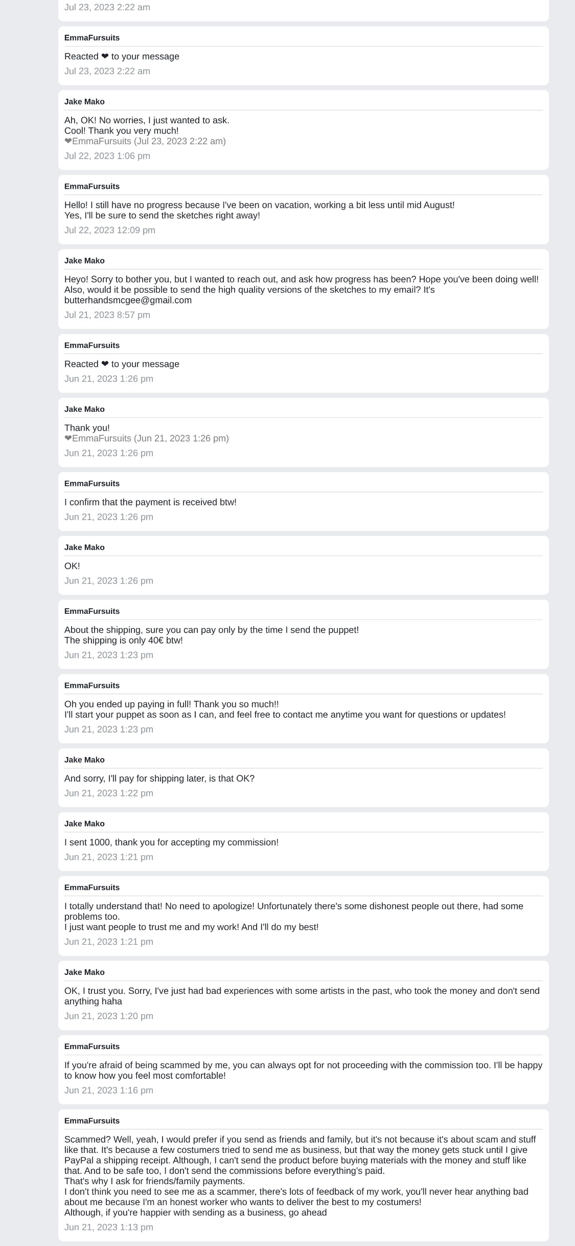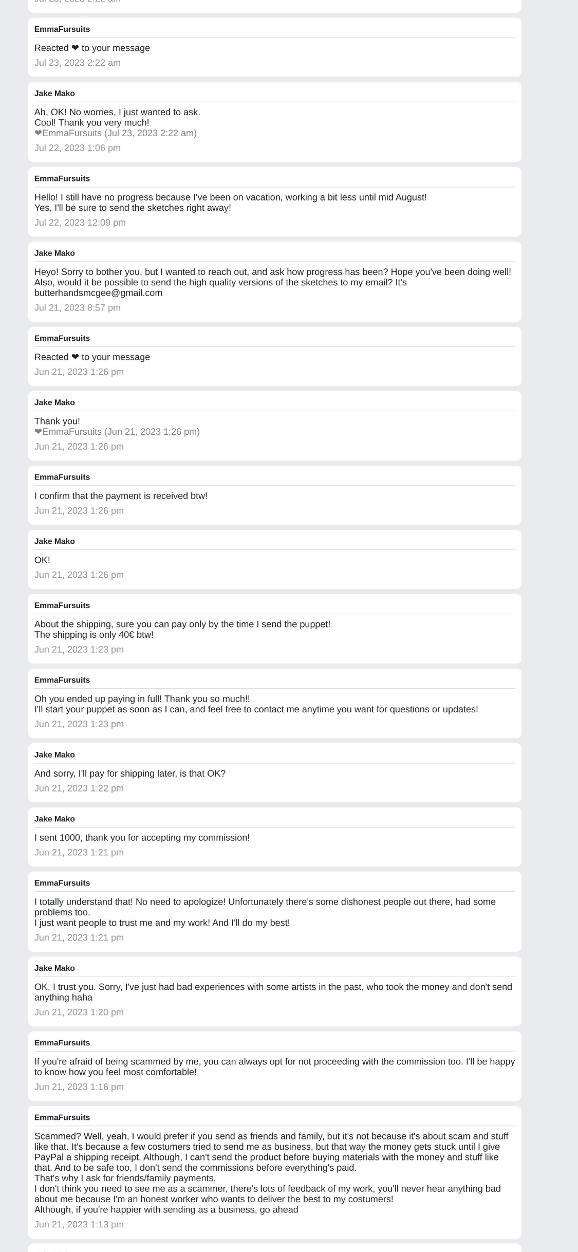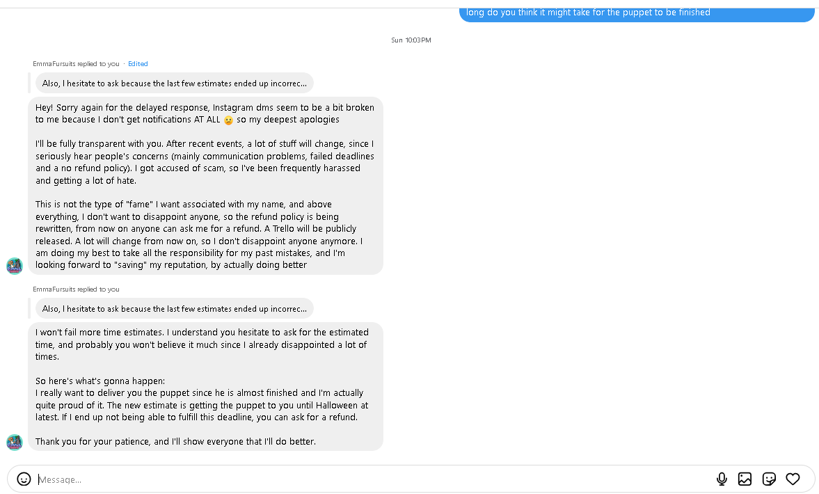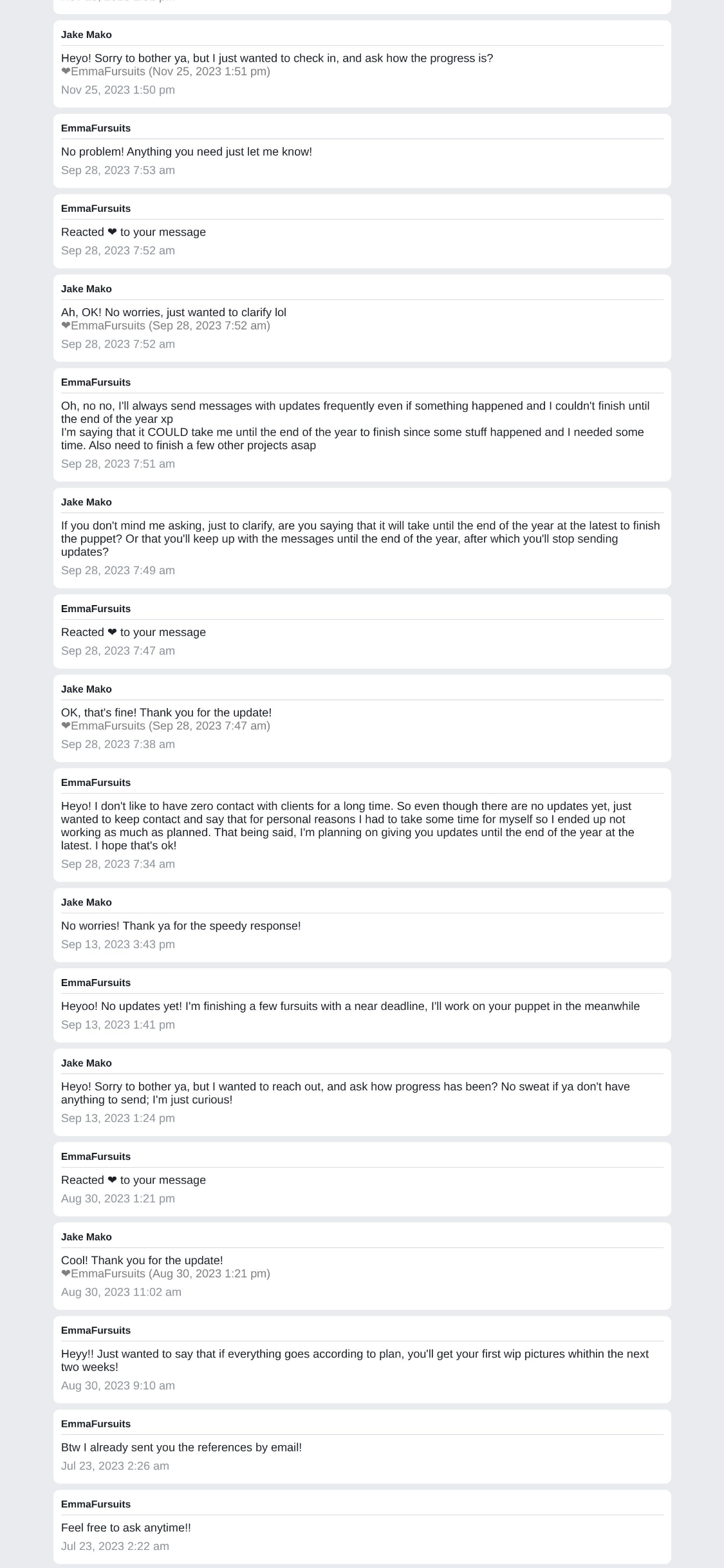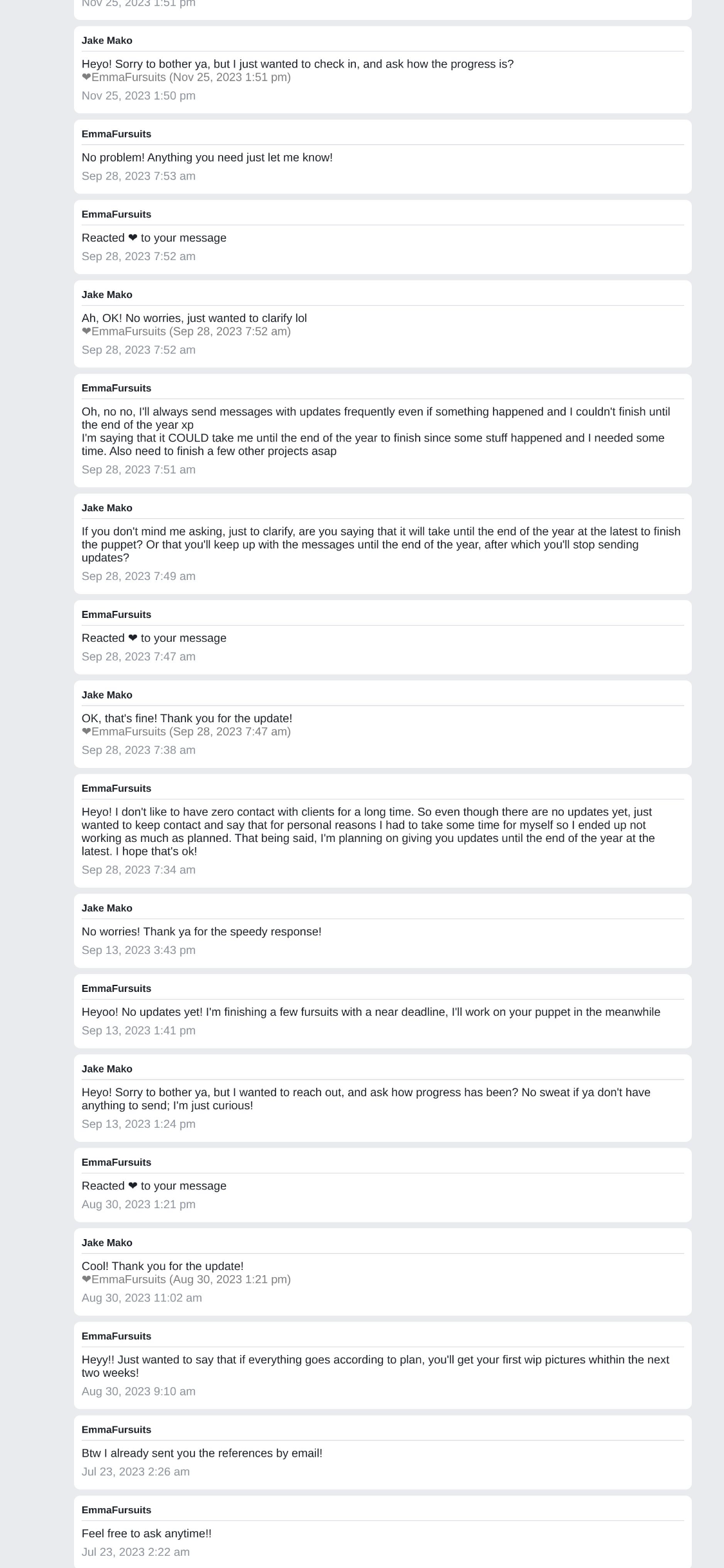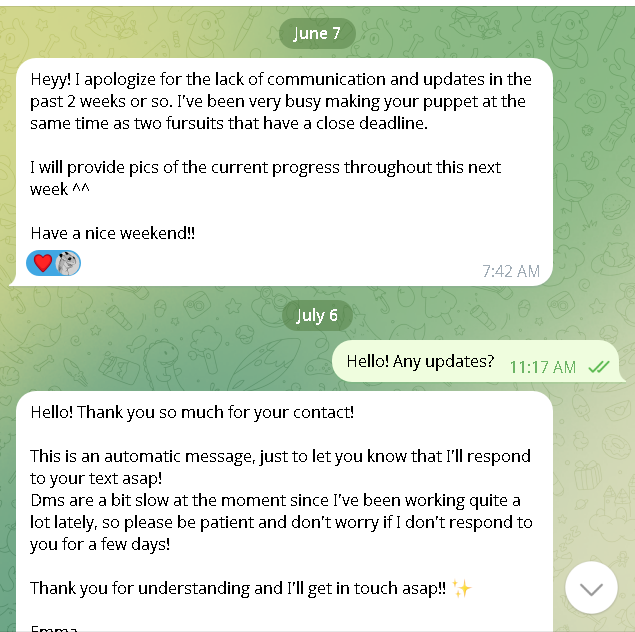 In June, 2023, I sent EmmaFursuits 1000 Euro for a puppet commission of my character. They requested I pay using friends and family, which I obliged, since I didn’t see anywhere that there were any issues commissioning them. They said that puppets wouldn’t take as long as fursuits, and that they would be separate queues so it would be done soon. I ended up hesitating after a few months went by with little update, and I requested a refund if they hadn’t already ordered the materials, which their TOS states that once materials are purchased there are no refunds. They told me they had already purchased the materials, but didn’t share evidence of such, so I trusted them, and took them at their word, and continued the commission. They promised several deadlines over the two years I have waited, which they have repeatedly failed to meet. Over that time they have occasionally sent updates, which usually have some degree of progress but the pace indicated that it would take a very long time for them to finish. Currently they have set their Telegram DMs to automatic response, so I have not seen a response with visual progress since May 16th, 2025. They posted a finished personal fursuit July 19th and completed several fursuits since my commission has started.
