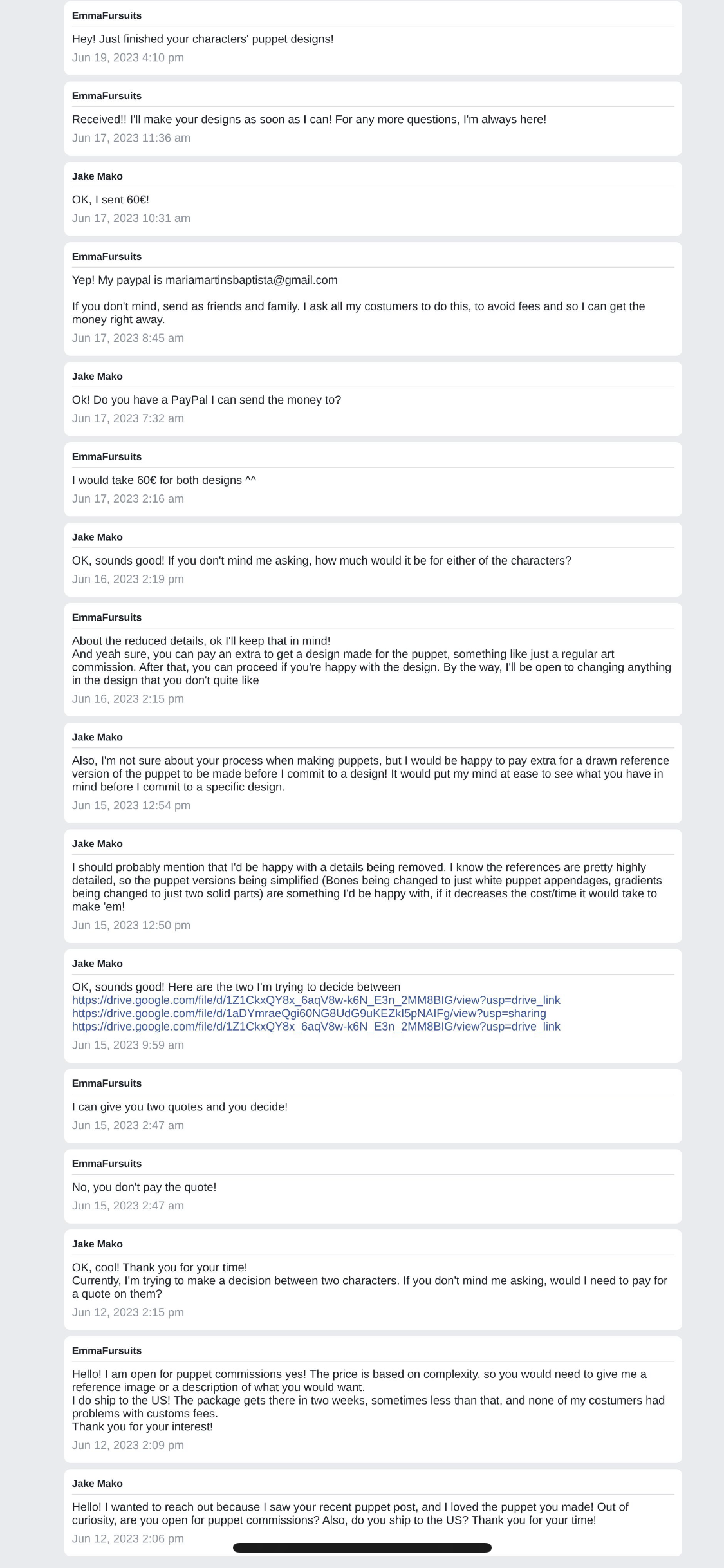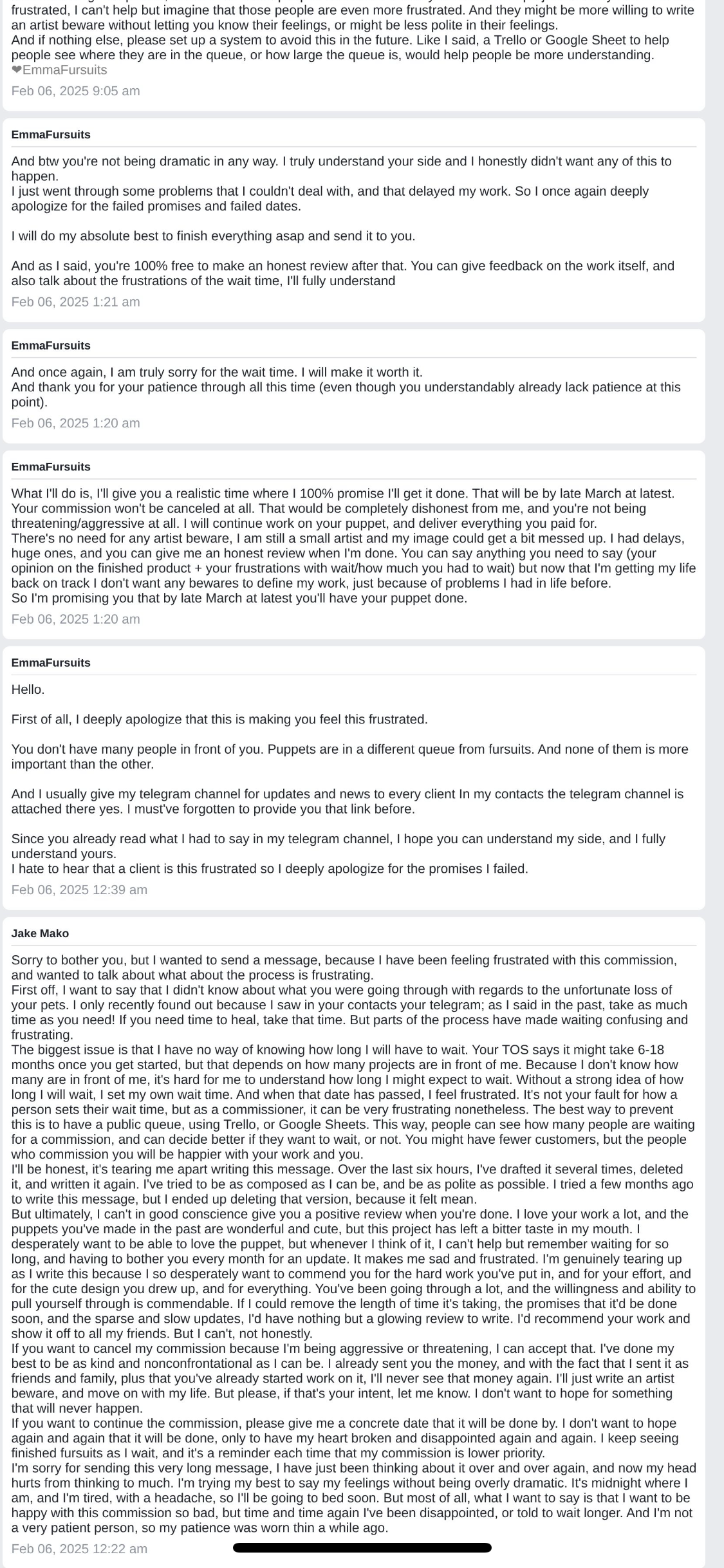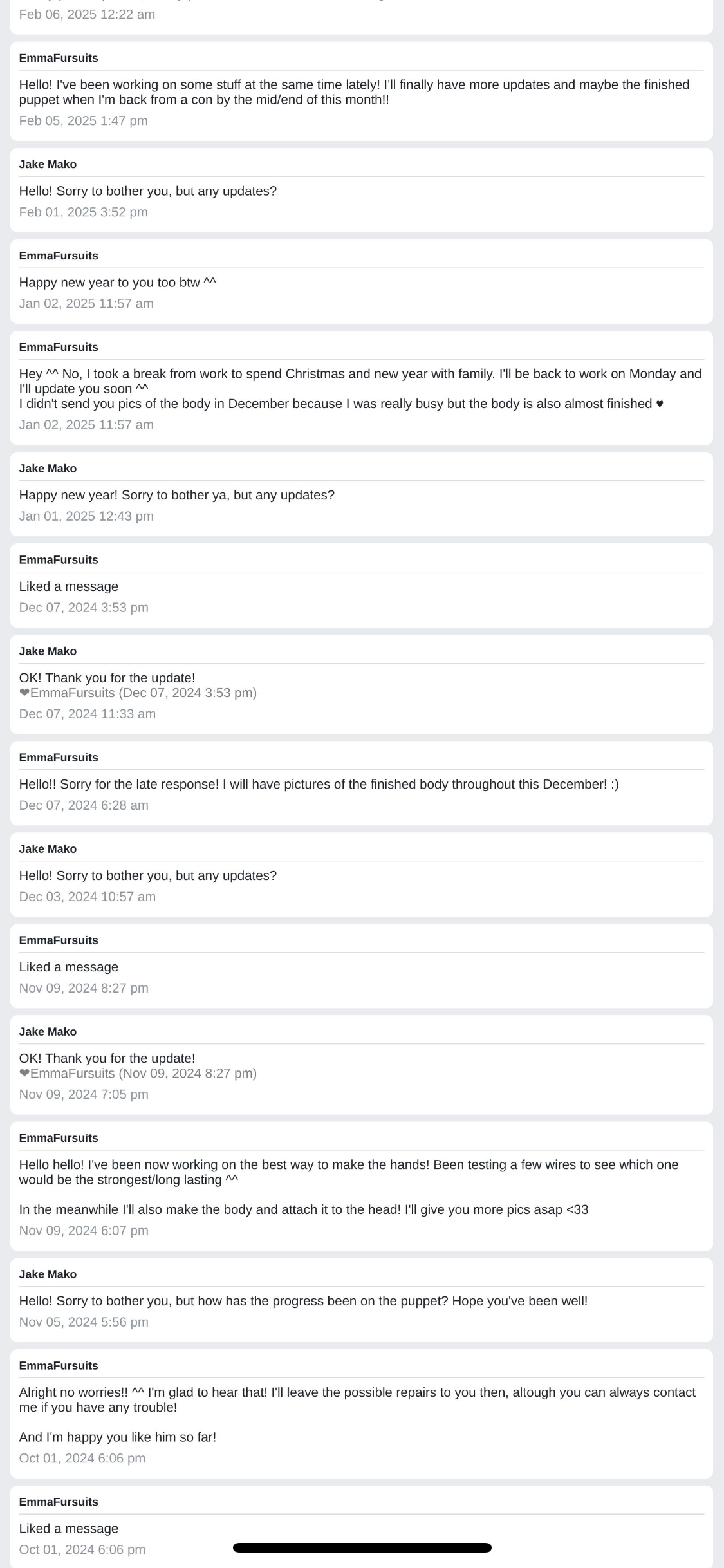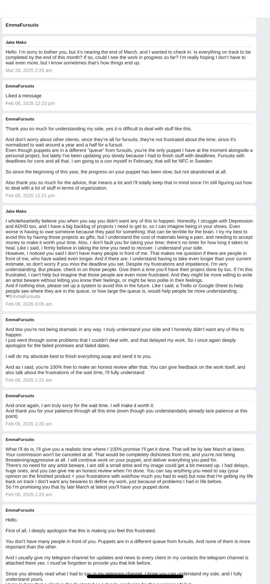 In June, 2023, I sent EmmaFursuits 1000 Euro for a puppet commission of my character. They requested I pay using friends and family, which I obliged, since I didn’t see anywhere that there were any issues commissioning them. They said that puppets wouldn’t take as long as fursuits, and that they would be separate queues so it would be done soon. I ended up hesitating after a few months went by with little update, and I requested a refund if they hadn’t already ordered the materials, which their TOS states that once materials are purchased there are no refunds. They told me they had already purchased the materials, but didn’t share evidence of such, so I trusted them, and took them at their word, and continued the commission. They promised several deadlines over the two years I have waited, which they have repeatedly failed to meet. Over that time they have occasionally sent updates, which usually have some degree of progress but the pace indicated that it would take a very long time for them to finish. Currently they have set their Telegram DMs to automatic response, so I have not seen a response with visual progress since May 16th, 2025. They posted a finished personal fursuit July 19th and completed several fursuits since my commission has started.