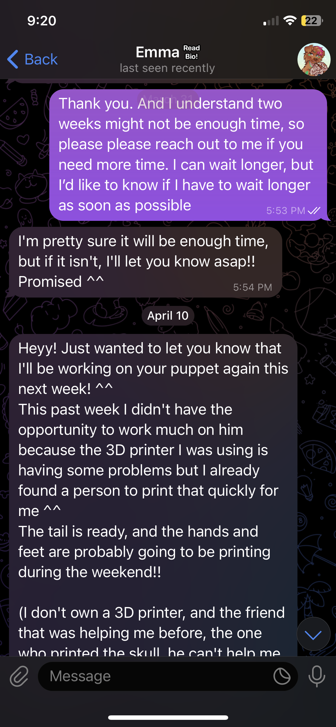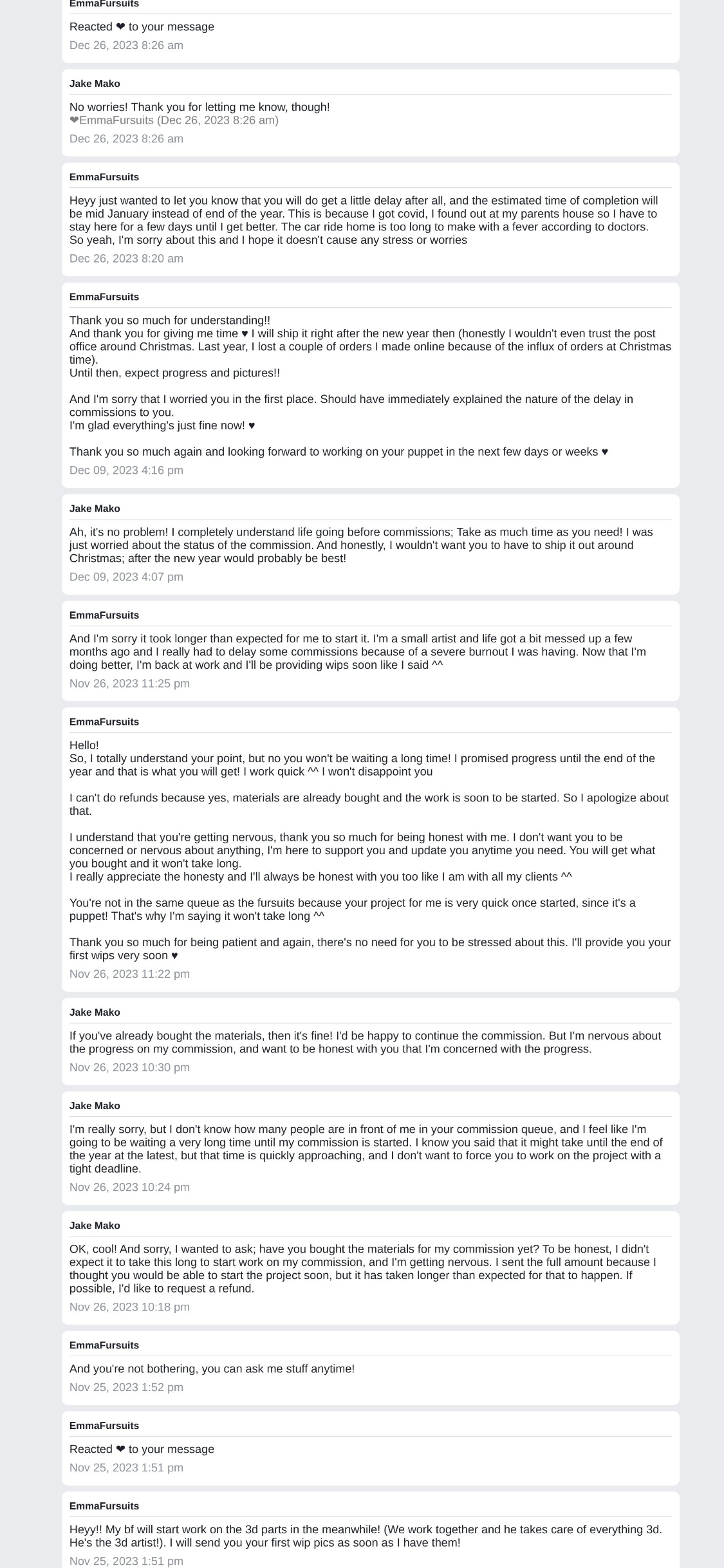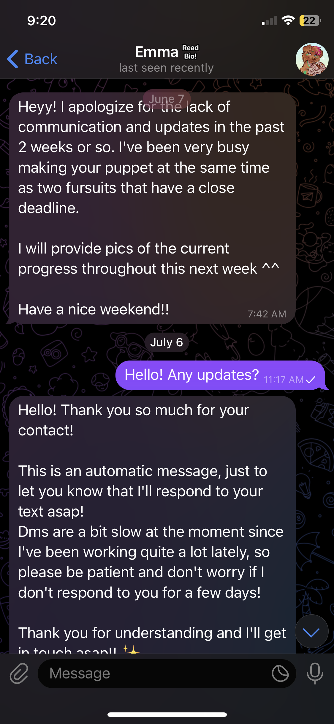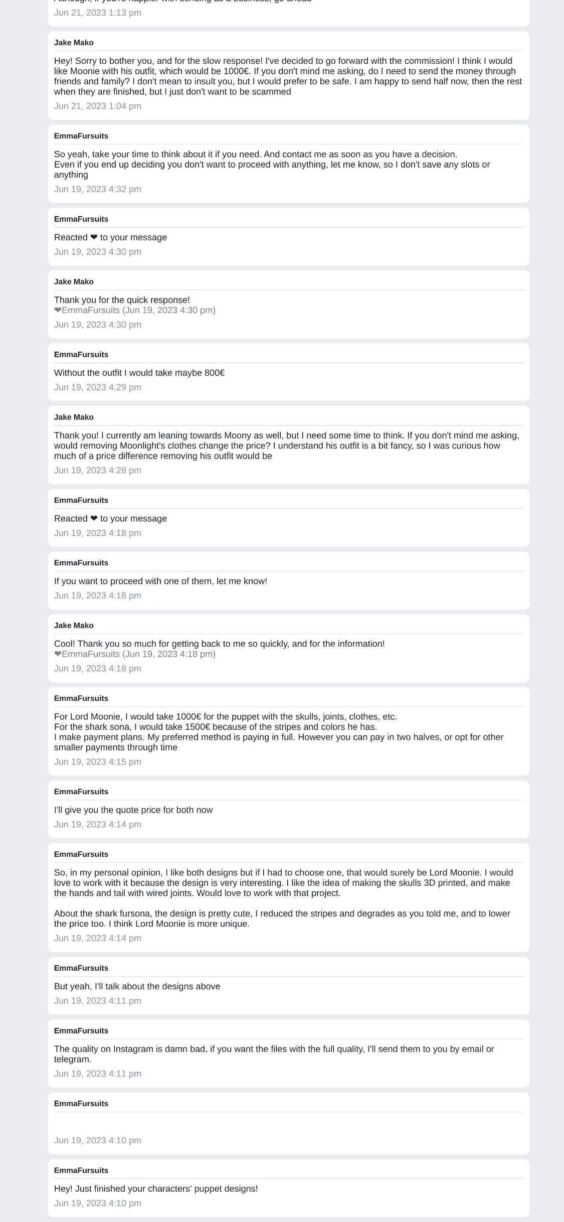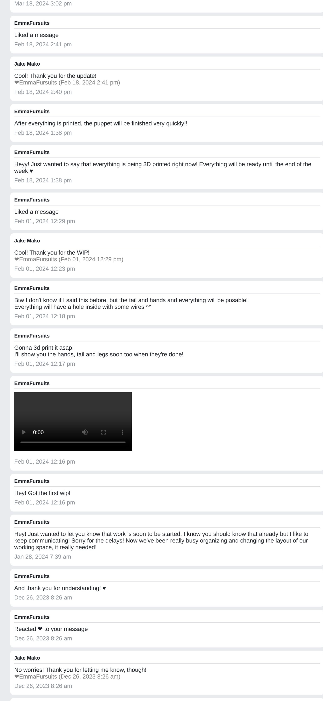 In June, 2023, I sent EmmaFursuits 1000 Euro for a puppet commission of my character. They requested I pay using friends and family, which I obliged, since I didn’t see anywhere that there were any issues commissioning them. They said that puppets wouldn’t take as long as fursuits, and that they would be separate queues so it would be done soon. I ended up hesitating after a few months went by with little update, and I requested a refund if they hadn’t already ordered the materials, which their TOS states that once materials are purchased there are no refunds. They told me they had already purchased the materials, but didn’t share evidence of such, so I trusted them, and took them at their word, and continued the commission. They promised several deadlines over the two years I have waited, which they have repeatedly failed to meet. Over that time they have occasionally sent updates, which usually have some degree of progress but the pace indicated that it would take a very long time for them to finish. Currently they have set their Telegram DMs to automatic response, so I have not seen a response with visual progress since May 16th, 2025. They posted a finished personal fursuit July 19th and completed several fursuits since my commission has started.