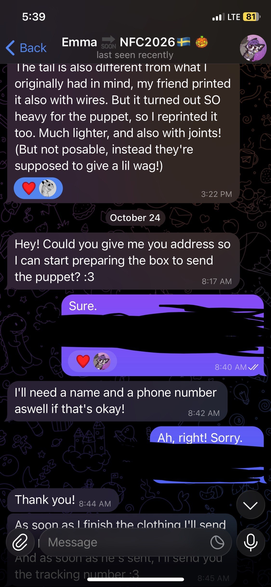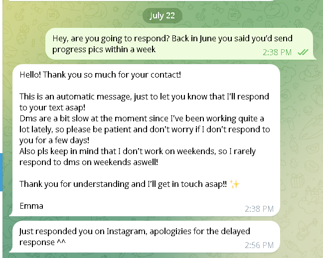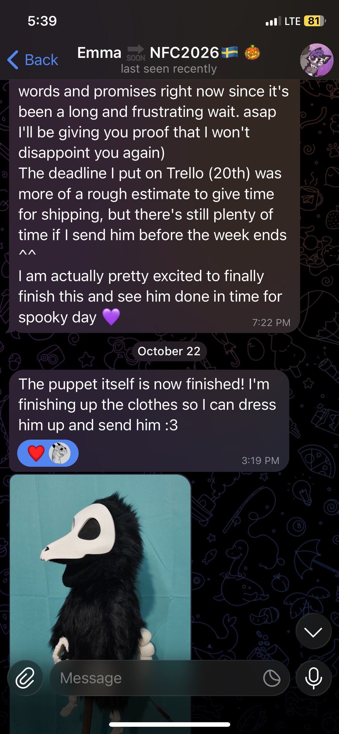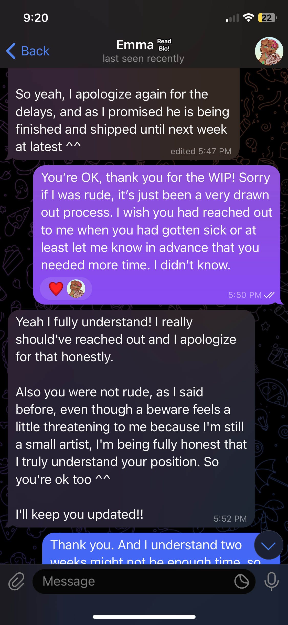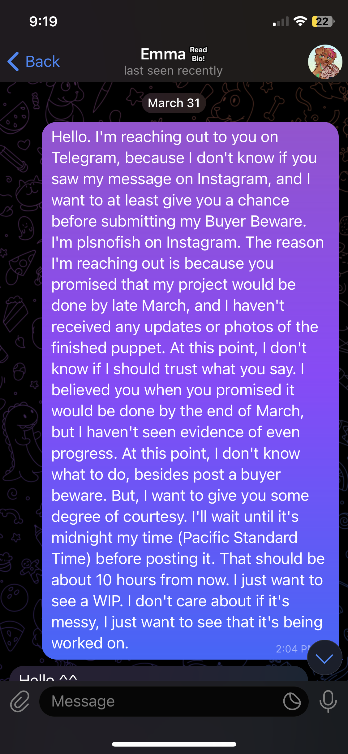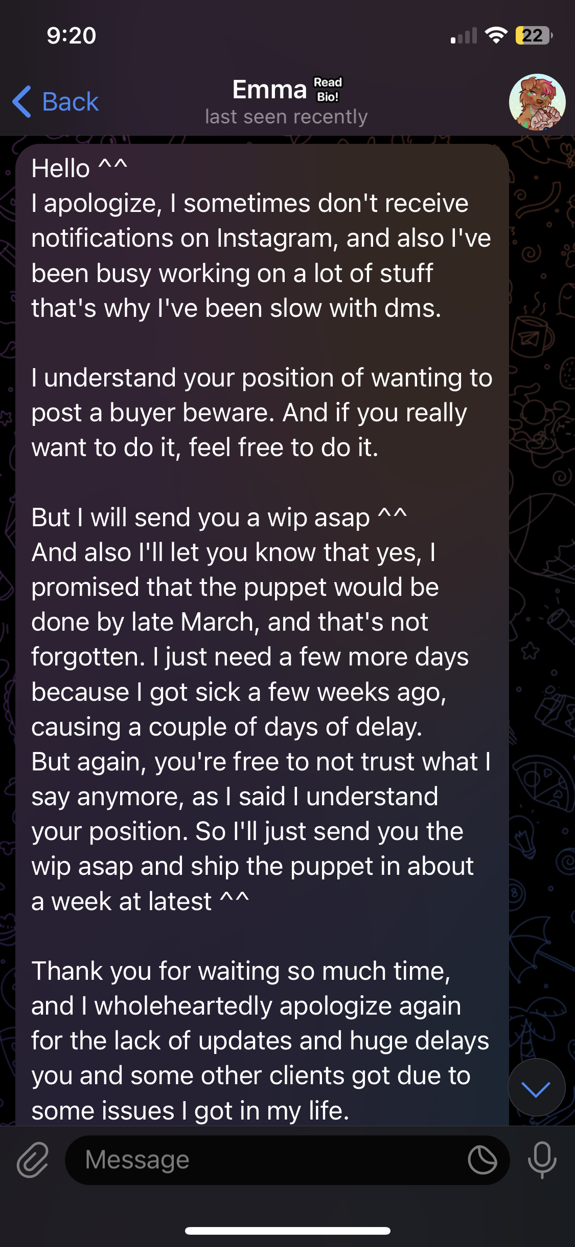 In June, 2023, I sent EmmaFursuits 1000 Euro for a puppet commission of my character. They requested I pay using friends and family, which I obliged, since I didn’t see anywhere that there were any issues commissioning them. They said that puppets wouldn’t take as long as fursuits, and that they would be separate queues so it would be done soon. I ended up hesitating after a few months went by with little update, and I requested a refund if they hadn’t already ordered the materials, which their TOS states that once materials are purchased there are no refunds. They told me they had already purchased the materials, but didn’t share evidence of such, so I trusted them, and took them at their word, and continued the commission. They promised several deadlines over the two years I have waited, which they have repeatedly failed to meet. Over that time they have occasionally sent updates, which usually have some degree of progress but the pace indicated that it would take a very long time for them to finish. Currently they have set their Telegram DMs to automatic response, so I have not seen a response with visual progress since May 16th, 2025. They posted a finished personal fursuit July 19th and completed several fursuits since my commission has started.
