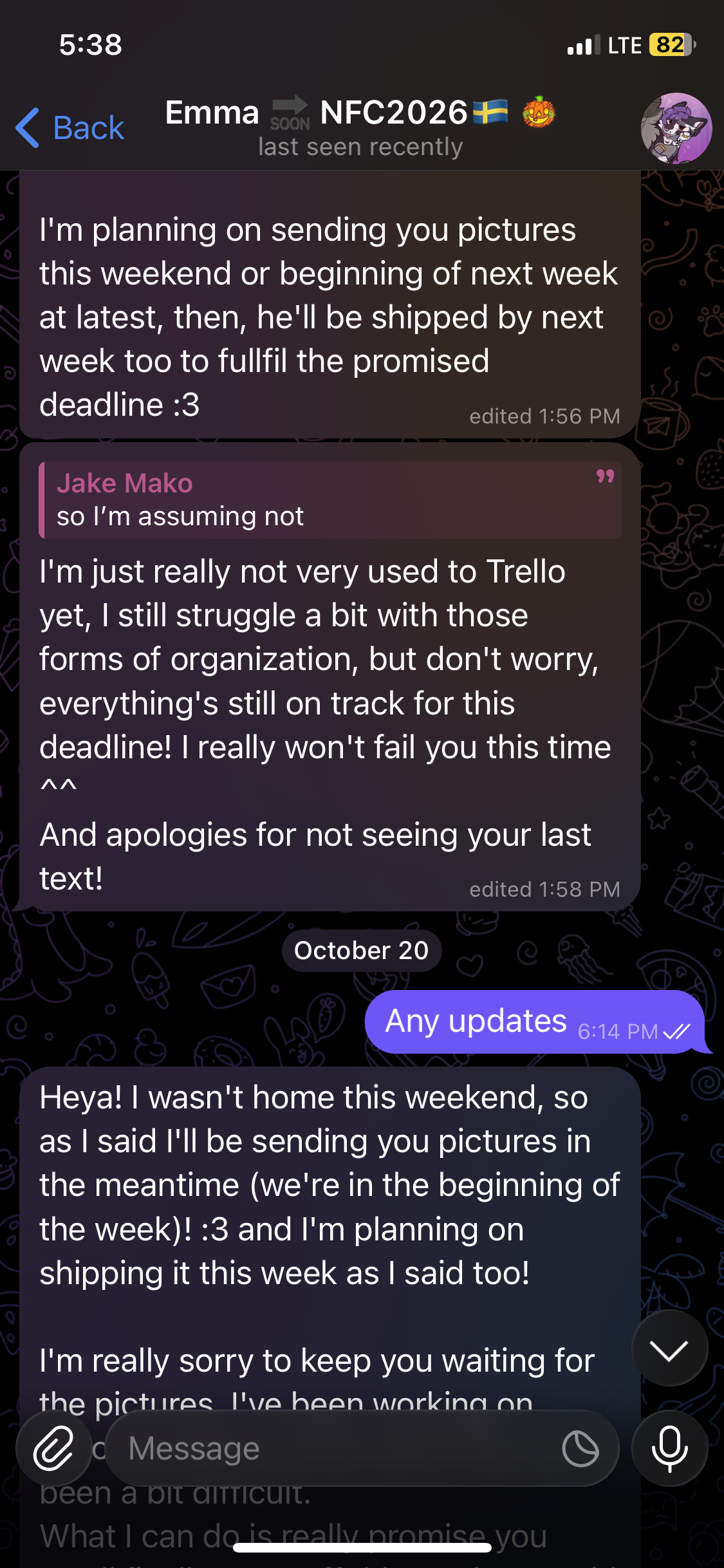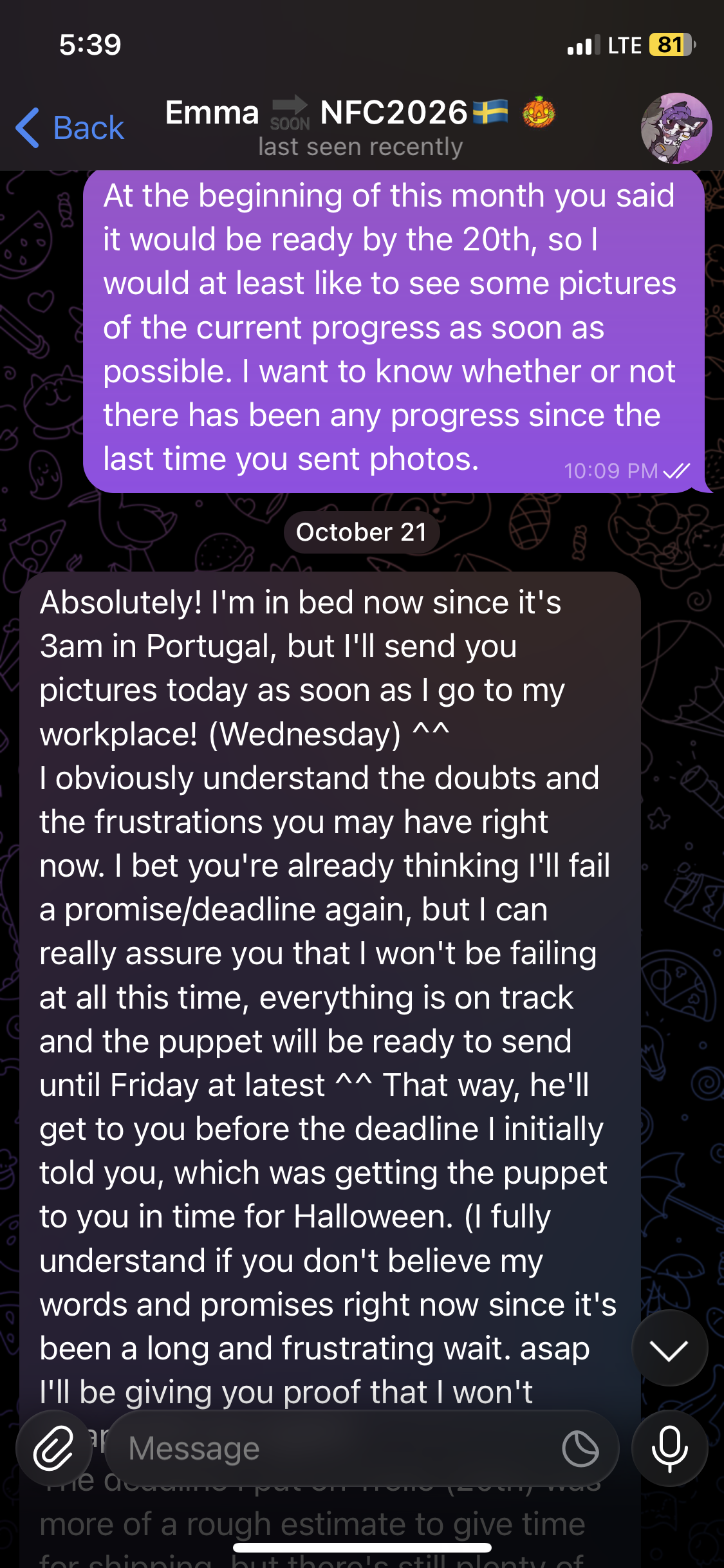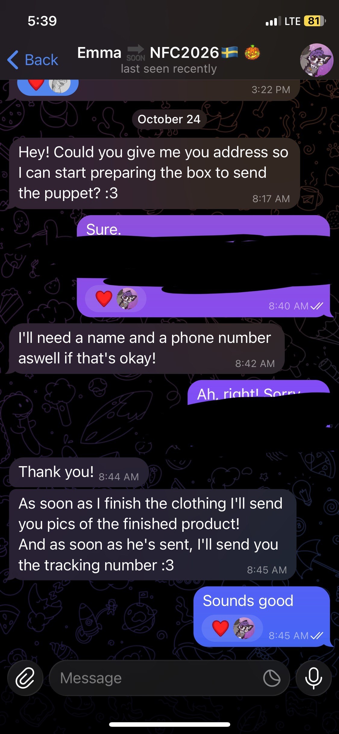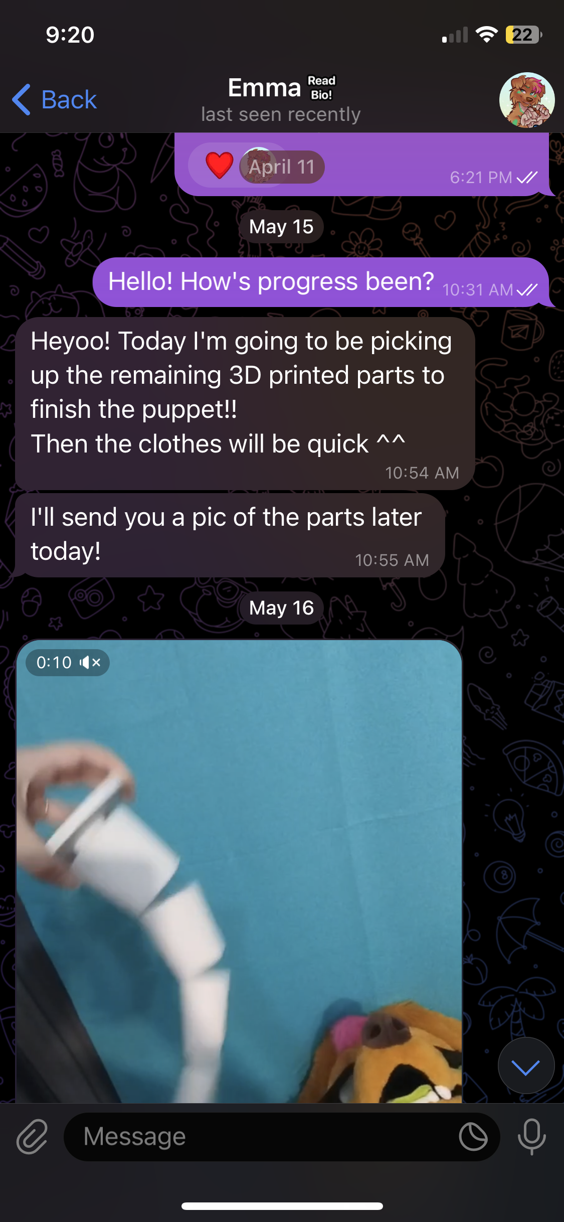 In June, 2023, I sent EmmaFursuits 1000 Euro for a puppet commission of my character. They requested I pay using friends and family, which I obliged, since I didn’t see anywhere that there were any issues commissioning them. They said that puppets wouldn’t take as long as fursuits, and that they would be separate queues so it would be done soon. I ended up hesitating after a few months went by with little update, and I requested a refund if they hadn’t already ordered the materials, which their TOS states that once materials are purchased there are no refunds. They told me they had already purchased the materials, but didn’t share evidence of such, so I trusted them, and took them at their word, and continued the commission. They promised several deadlines over the two years I have waited, which they have repeatedly failed to meet. Over that time they have occasionally sent updates, which usually have some degree of progress but the pace indicated that it would take a very long time for them to finish. Currently they have set their Telegram DMs to automatic response, so I have not seen a response with visual progress since May 16th, 2025. They posted a finished personal fursuit July 19th and completed several fursuits since my commission has started.