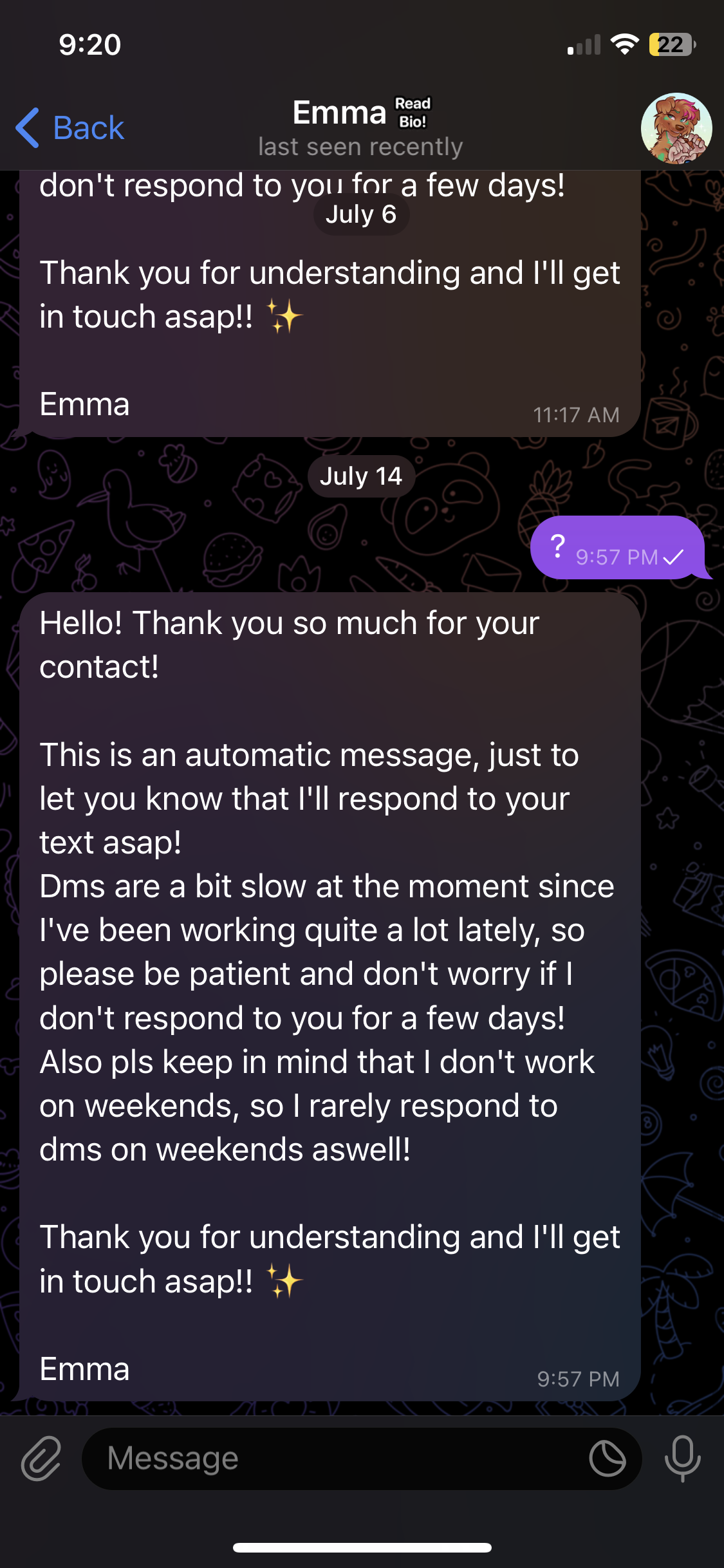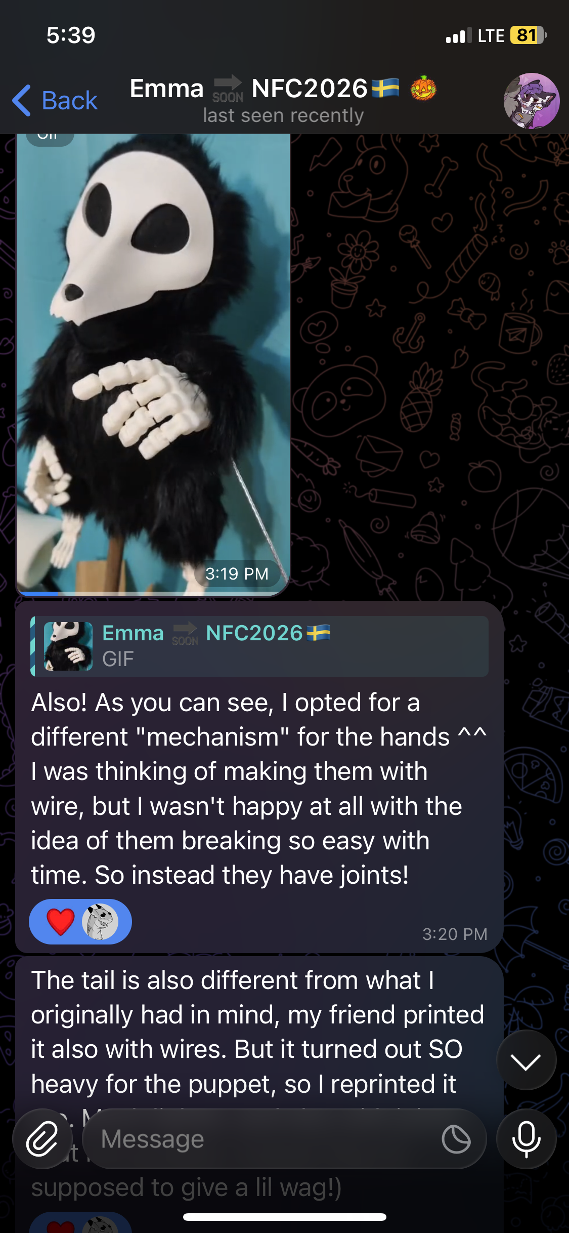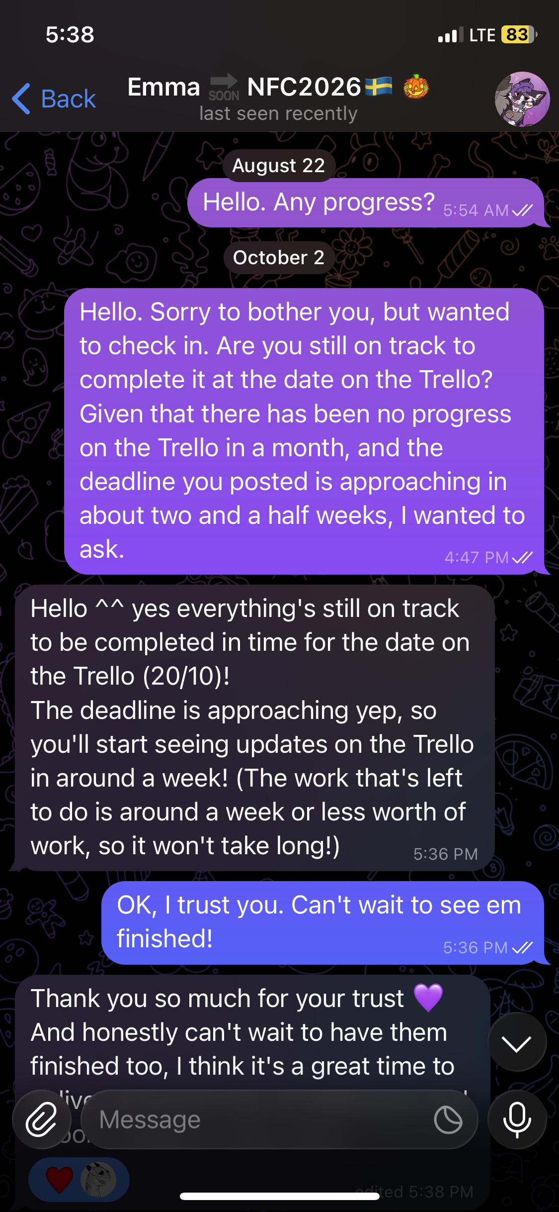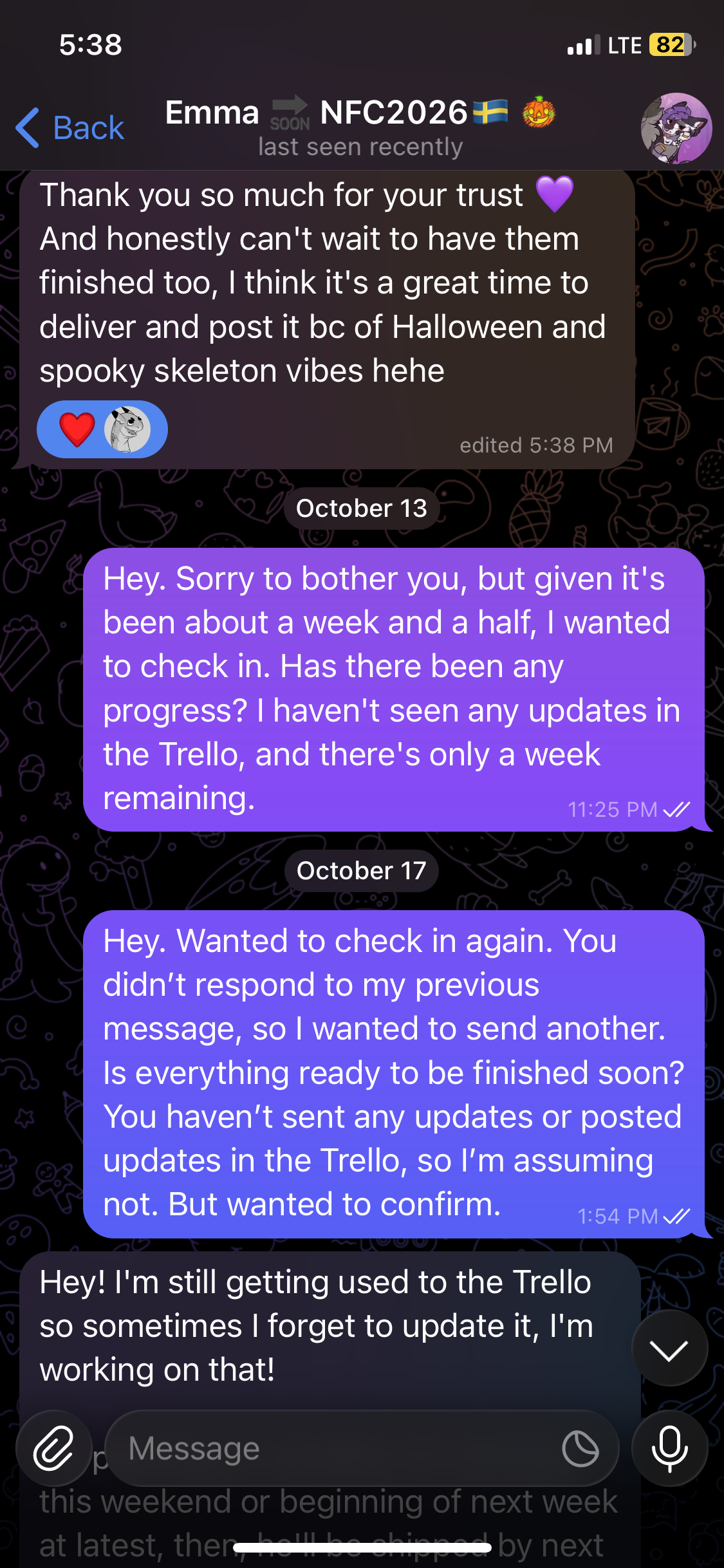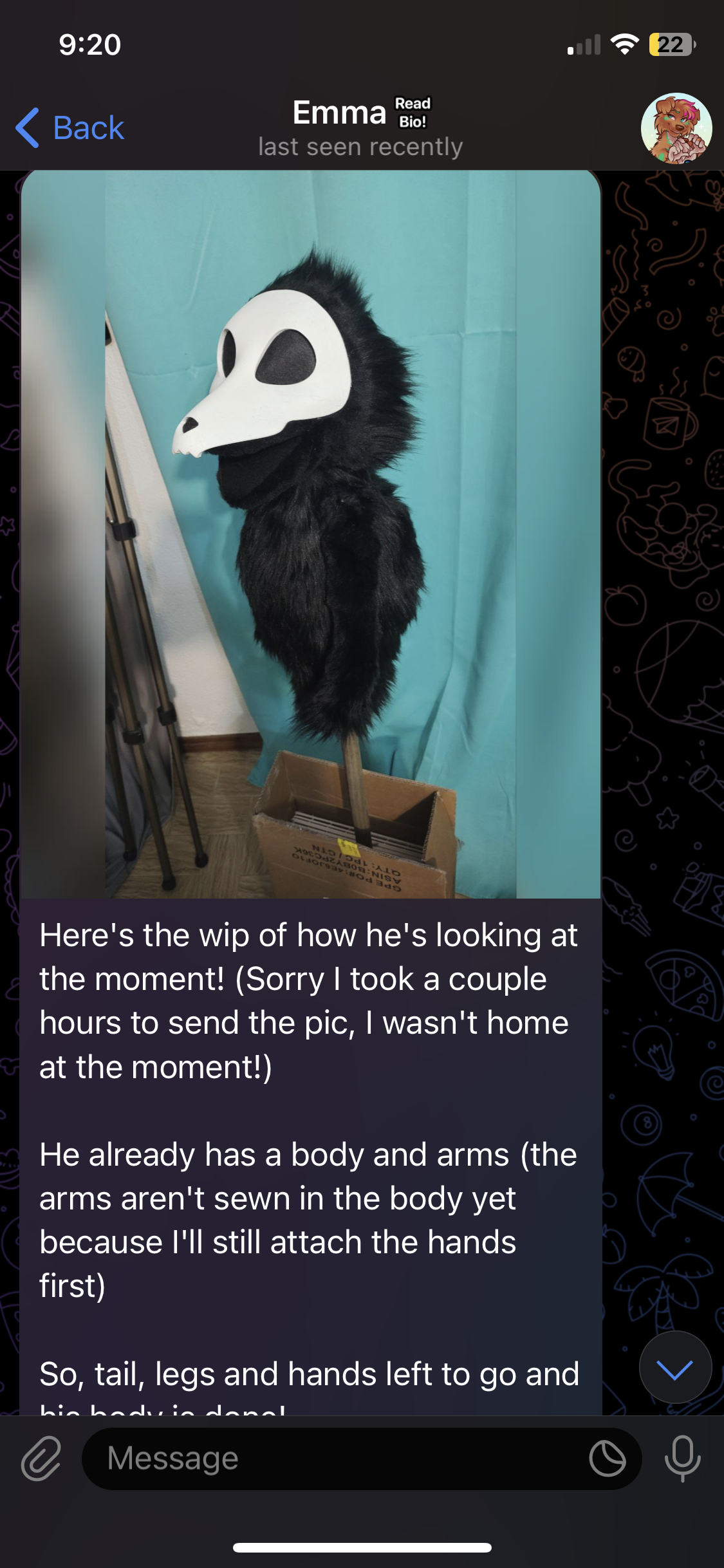 In June, 2023, I sent EmmaFursuits 1000 Euro for a puppet commission of my character. They requested I pay using friends and family, which I obliged, since I didn’t see anywhere that there were any issues commissioning them. They said that puppets wouldn’t take as long as fursuits, and that they would be separate queues so it would be done soon. I ended up hesitating after a few months went by with little update, and I requested a refund if they hadn’t already ordered the materials, which their TOS states that once materials are purchased there are no refunds. They told me they had already purchased the materials, but didn’t share evidence of such, so I trusted them, and took them at their word, and continued the commission. They promised several deadlines over the two years I have waited, which they have repeatedly failed to meet. Over that time they have occasionally sent updates, which usually have some degree of progress but the pace indicated that it would take a very long time for them to finish. Currently they have set their Telegram DMs to automatic response, so I have not seen a response with visual progress since May 16th, 2025. They posted a finished personal fursuit July 19th and completed several fursuits since my commission has started.
